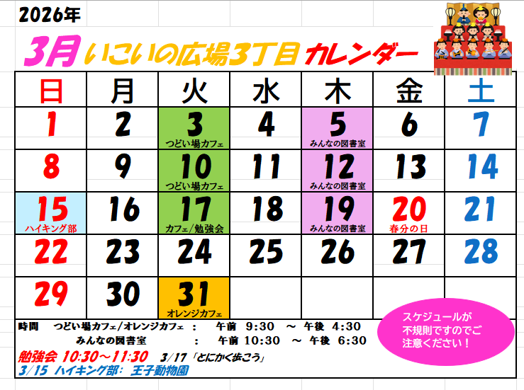 いこいの広場3丁目 3月の活動カレンダーです