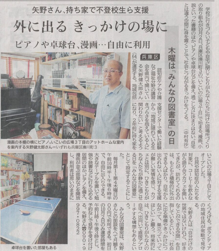 第二の居場所「みんなの図書室」がオープンしました! 2025 10/09 ニュース 2025年10月9日 まずはお電話かメール、お問い合わせ欄でお気軽にご相談ください。お待ちしています。 ニュース #177 「笑いは世界を救う」 関連記事 いこいの広場3丁目がお届けする映画上映会のお知らせ 2025年8月10日 8月の活動カレンダーです 2025年7月27日 いこいの広場3丁目 5月のカレンダーです 2025年4月27日 いこいの広場4月のカレンダーです 2025年4月2日 いこいの広場3丁目3月のカレンダーです 2025年2月24日 2025年新年あけましておめでとうございます。 2024年12月31日 いこいの広場12月のカレンダーです 2024年11月30日 ちいきの居場所 いこいの広場3丁目の11月の活動カレンダーです! 2024年10月30日 コメント コメントする コメントをキャンセルコメント ※ 名前 ※ メール ※ サイト 次回のコメントで使用するためブラウザーに自分の名前、メールアドレス、サイトを保存する。